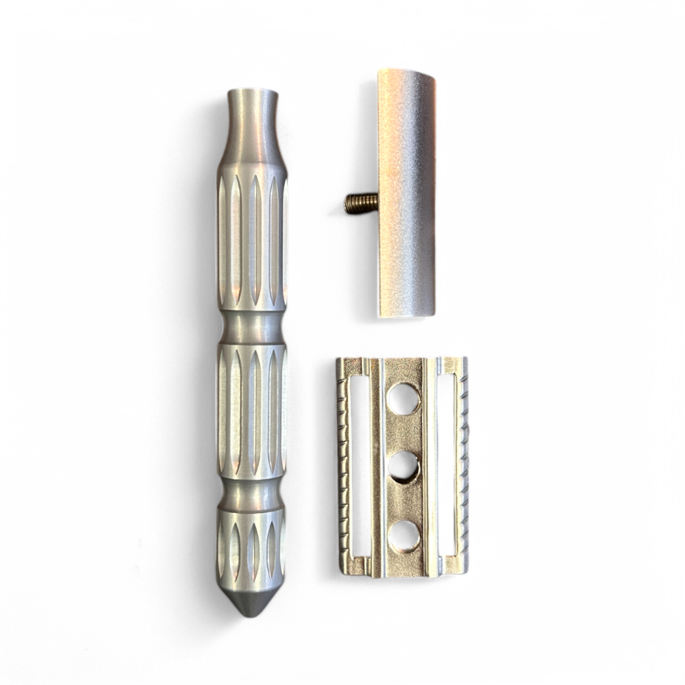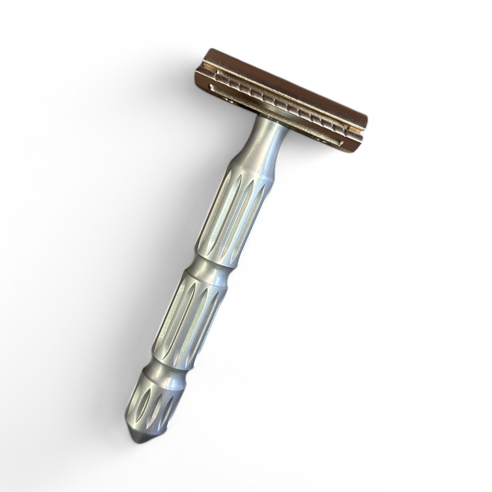 Gefertigt aus einer satinierten Zamak-Kopfplatte und einem leichten Aluminiumgriff, besticht der Gladio durch sein einzigartiges Design. Die vertikalen Rillen des Griffs garantieren einen sicheren Halt – selbst bei feuchten Händen. Die sorgfältige Verarbeitung unterstreicht die Langlebigkeit und hohe Qualität dieses Modells.