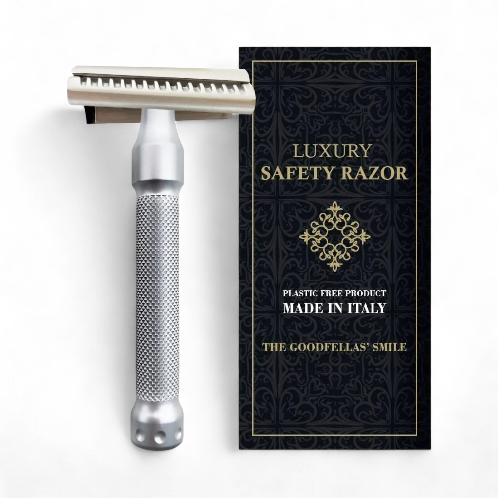 Der The Goodfellas‘ Smile Rasierhobel Legione kombiniert elegantes Design mit herausragender Funktionalität und ist perfekt für eine sanfte, aber gründliche Rasur. Nach über einem Jahr Entwicklungszeit präsentiert sich der Legione als Slant Rasierhobel mit geschlossenem Kamm, der durch seine gedrehte Kopfplatte der Rasierklinge mehr Spannung verleiht und somit ein präzises Rasurergebnis liefert. Die sanften Eigenschaften dieses Rasierhobels ermöglichen eine angenehme Rasur, die alle 1-2 Tage verwendet werden kann, ohne die Haut zu strapazieren. Die Kopfplatte besteht aus hochwertigem, satiniertem Zamak-Druckguss, während der Griff aus rostfreiem Edelstahl 303 AISI mit Hartchrom-Beschichtung gefertigt ist, was ihn extrem langlebig macht. Mit einer Grifflänge von 90 mm und einem Gewicht von ca. 67g liegt der Legione gut in der Hand und sorgt für ein komfortables Rasurerlebnis.