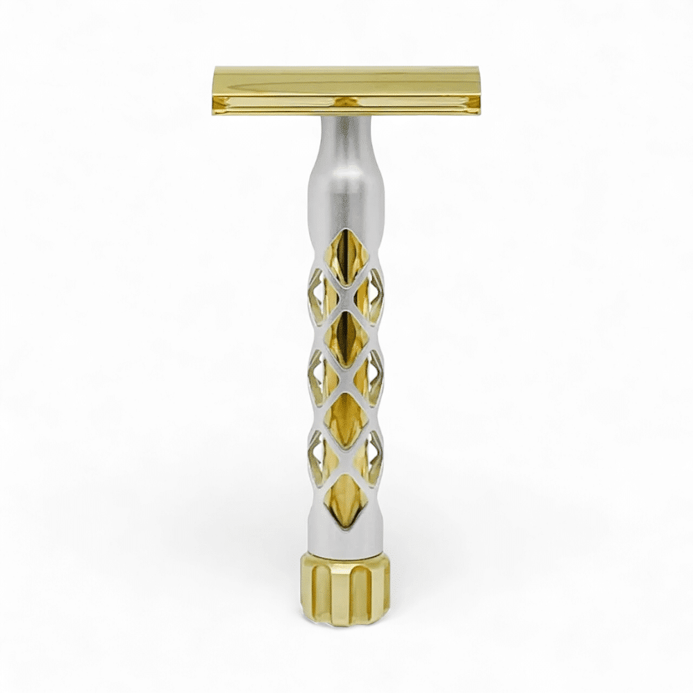 Der Valynor Rasierhobel hebt sich durch sein bemerkenswertes Design hervor. Der Griff ist aus silber eloxiertem Aluminium gefertigt, das sowohl optisch ansprechend als auch funktional ist. Die Eloxierung sorgt für eine widerstandsfähige Oberfläche, die kratzfest und pflegeleicht ist. Der Kopf und die Endkappe des Rasierhobels bestehen aus unbeschichtetem, maschinenpoliertem Messing, das dem Rasierer einen edlen Glanz verleiht und gleichzeitig robust und langlebig ist.